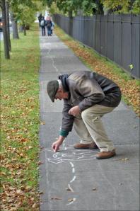 Members and supporters drew a line around the entire perimeter of the original Commons. Volunteers were supplied with chalk at various meeting points around the site.