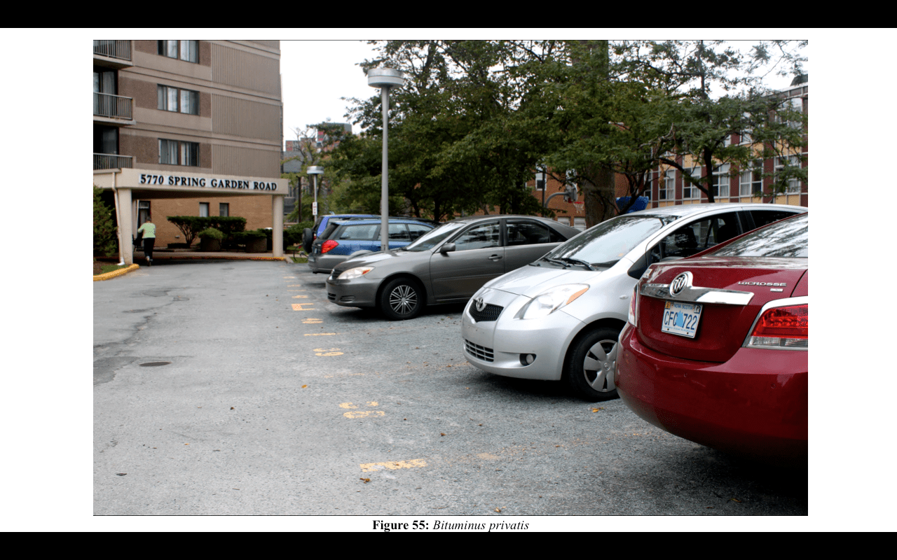 In October 2014 in participation with Photopolis, a city-wide celebration of photography, Friends of Halifax Common sponsored Parking The Common – Documentation of Phylum Paveia, a photographic exhibition. The photo exhibition, an artful collaboration between biologist Peggy Cameron and photographer Kathleen Flanagan identified and documented ‘Phylum Paveia’, an invasive species responsible for the creeping disappearance of the Halifax Common. The exhibition was shown on monitors at Dalhousie’s School of Architecture and Planning. It is available below for your viewing.